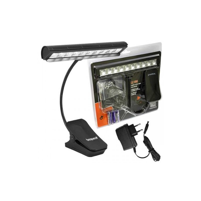 Lampada professionale a LED per leggio con 10 LED super luminosi, regolabile in due livelli di luminosità. Attacco a pinza con protezione in gomma e flessibile lungo 26 cm. Batterie (3 x AAA) ed alimentatore inclusi.