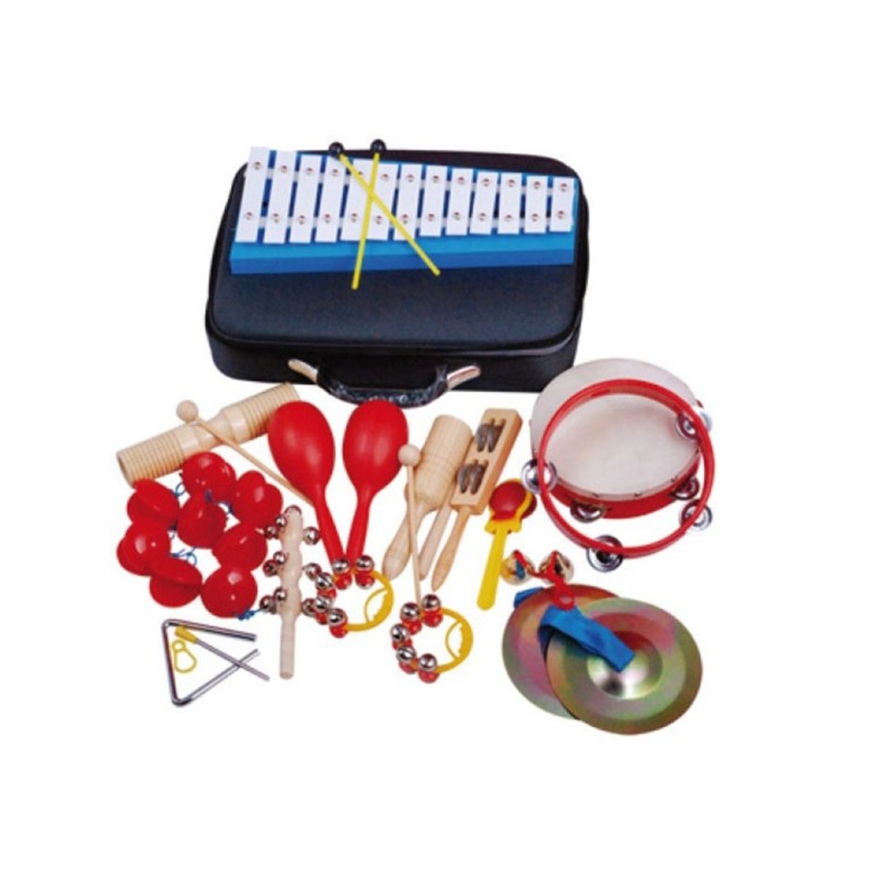 | Un'ampia selezione di piccole percussioni ritmiche ideali per gli usi scolastici. Il pack di percussioni è composto da tamburelli, cembali, triangolo, maracas, nacchere in plastica, campanellini, carillon, woodblock e da un tamburello. |